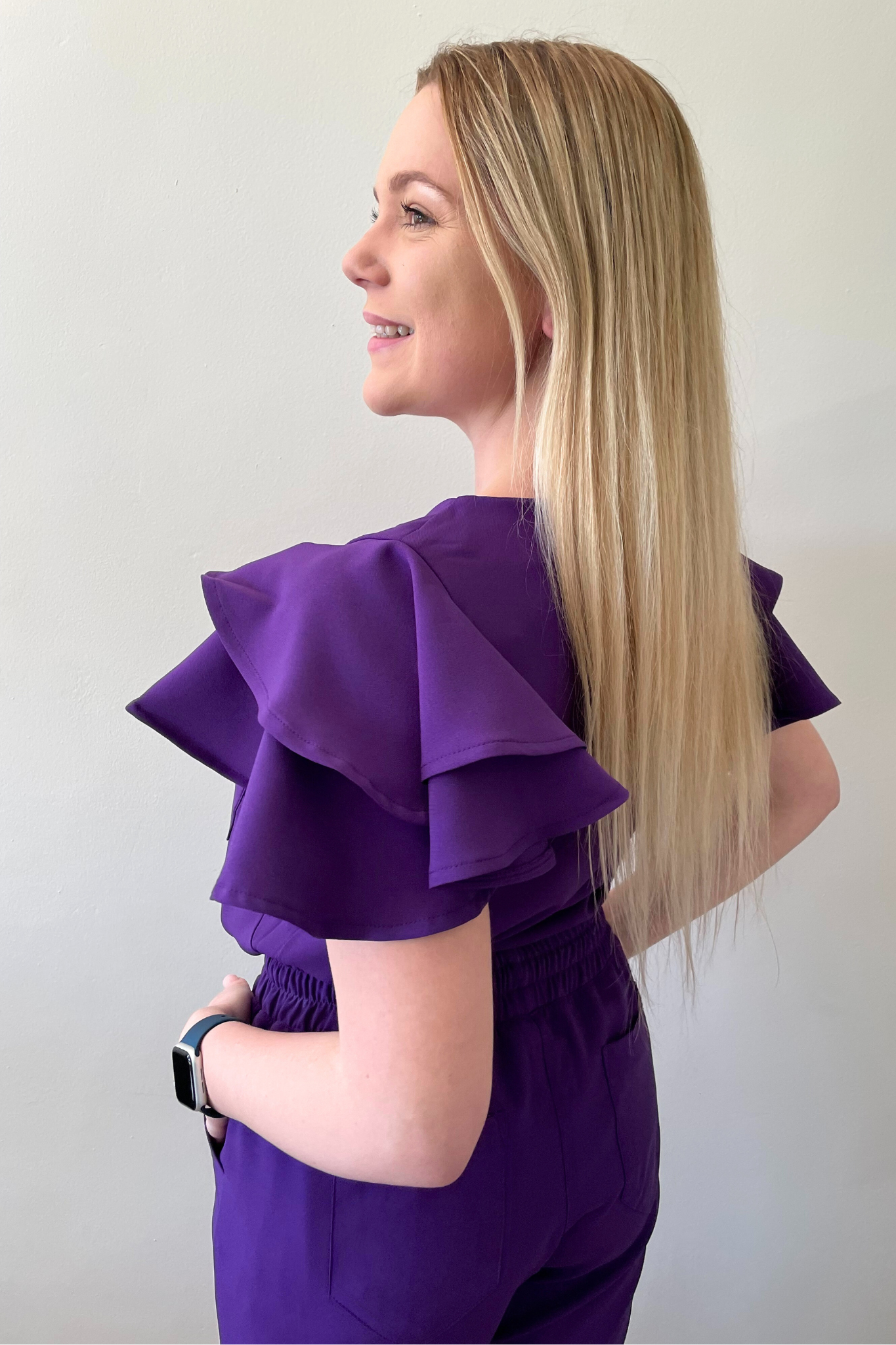 The slim fit follows your figure while providing coverage across bust and arms, and the signature frill sleeves add a feminine touch that also balances broad shoulders.