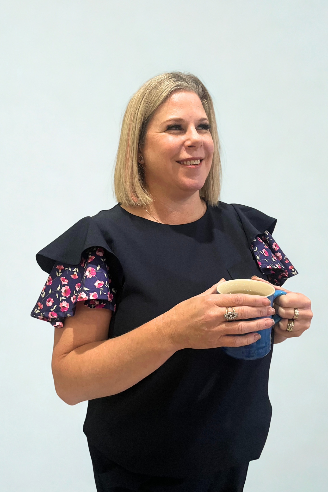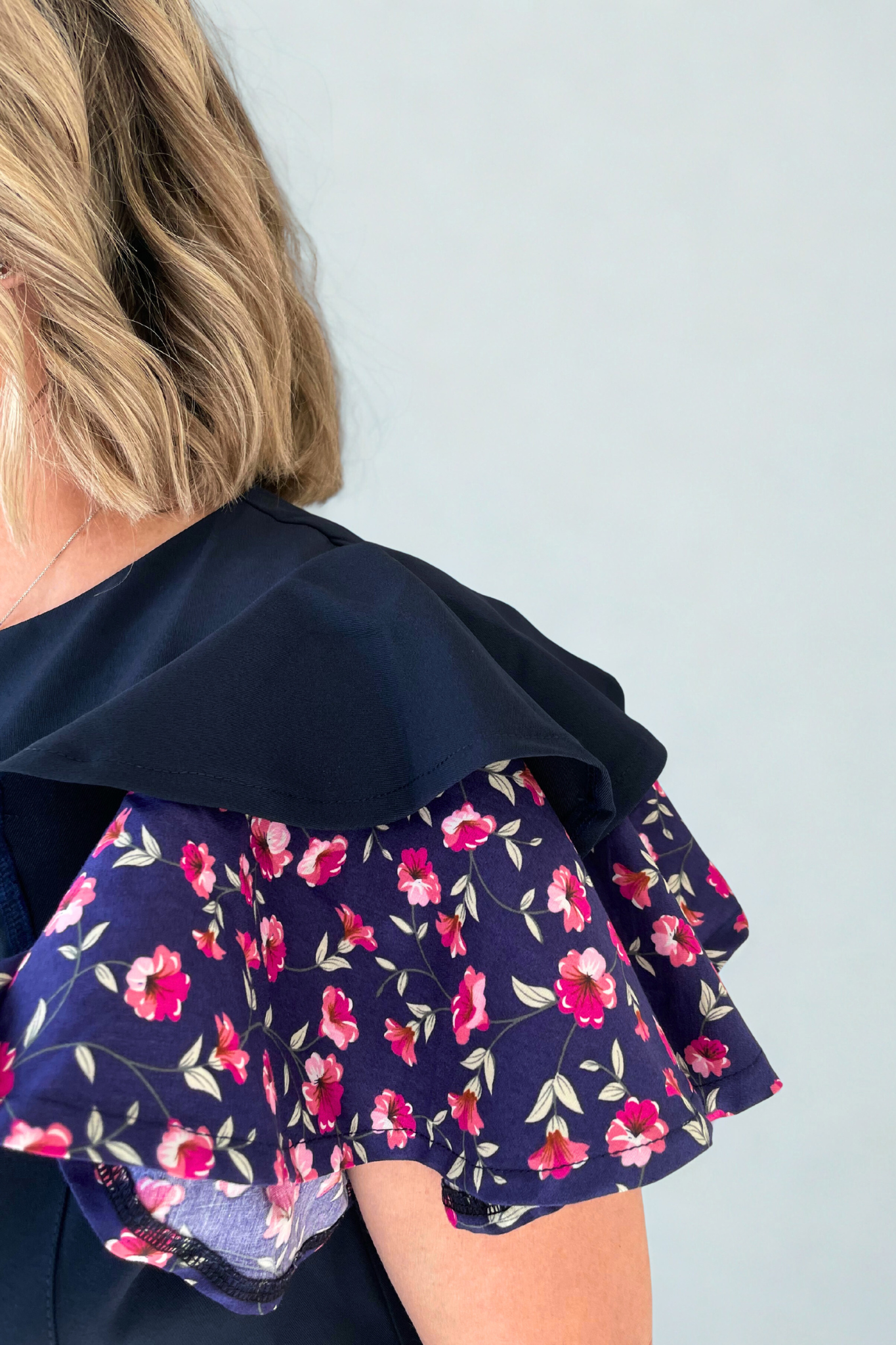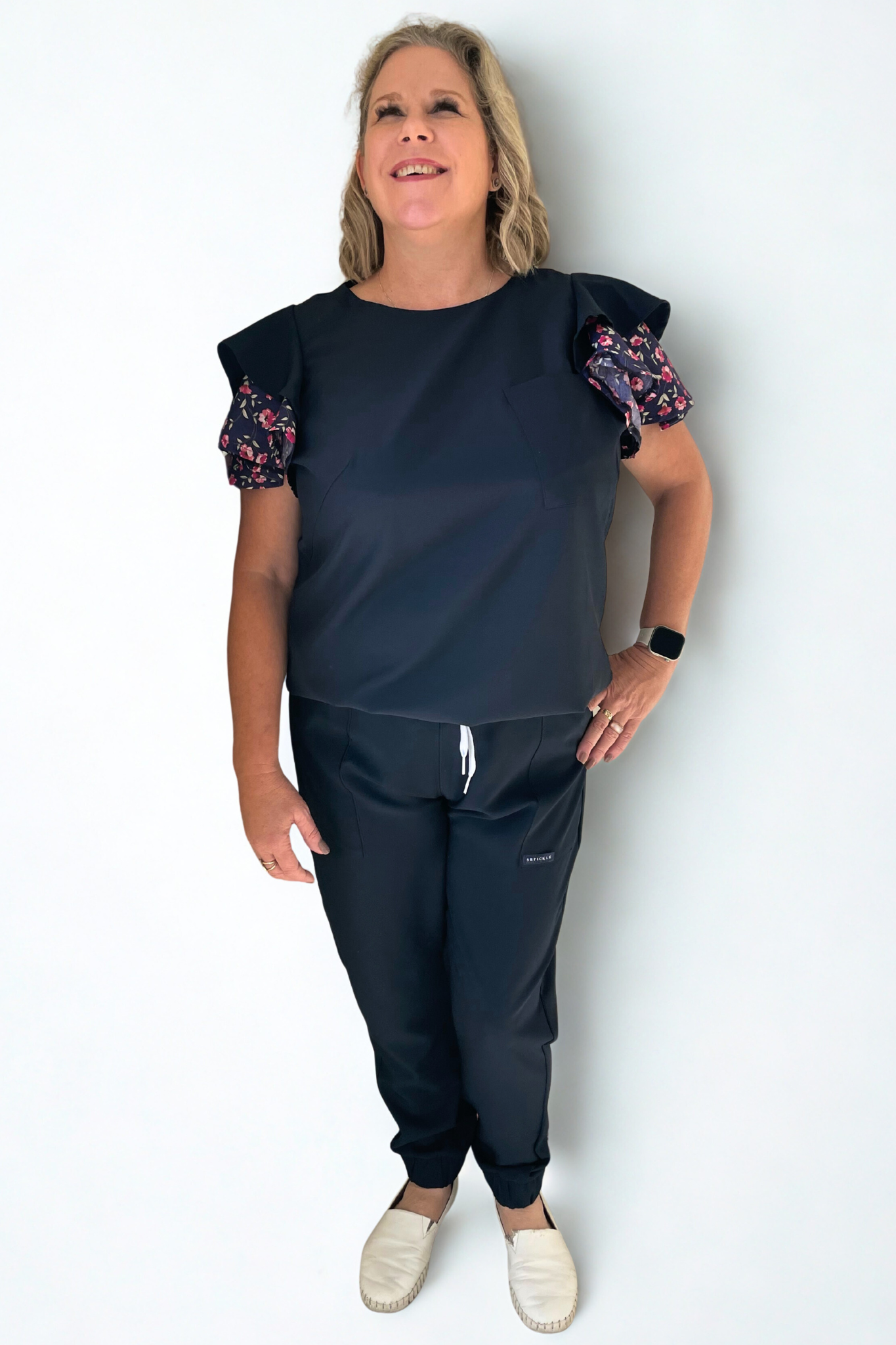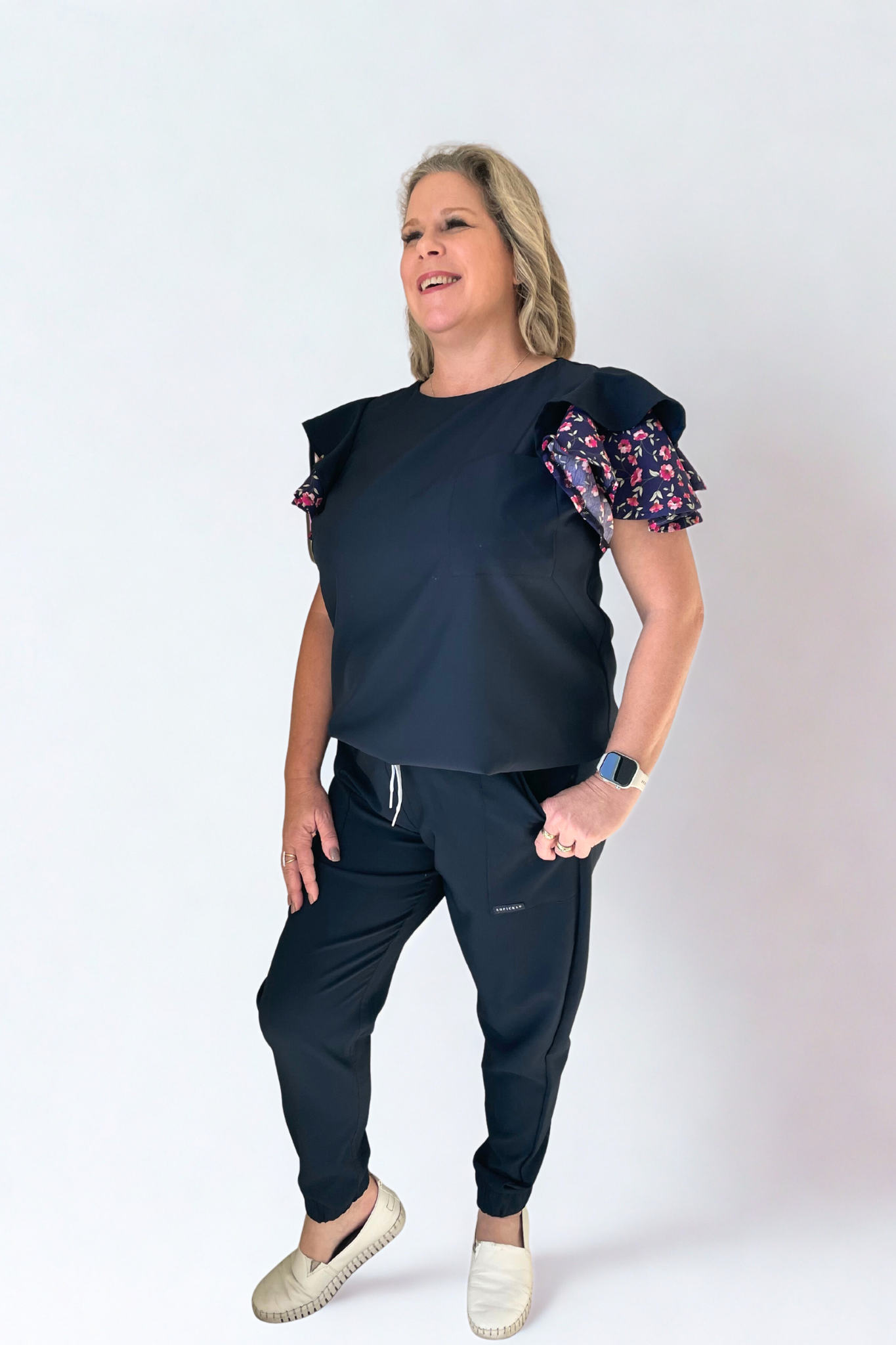 This set features a soft contrast frill along the sleeve, blooming with a delicate floral print. Feminine yet functional, this style brings a fresh, elevated twist to your wardrobe.